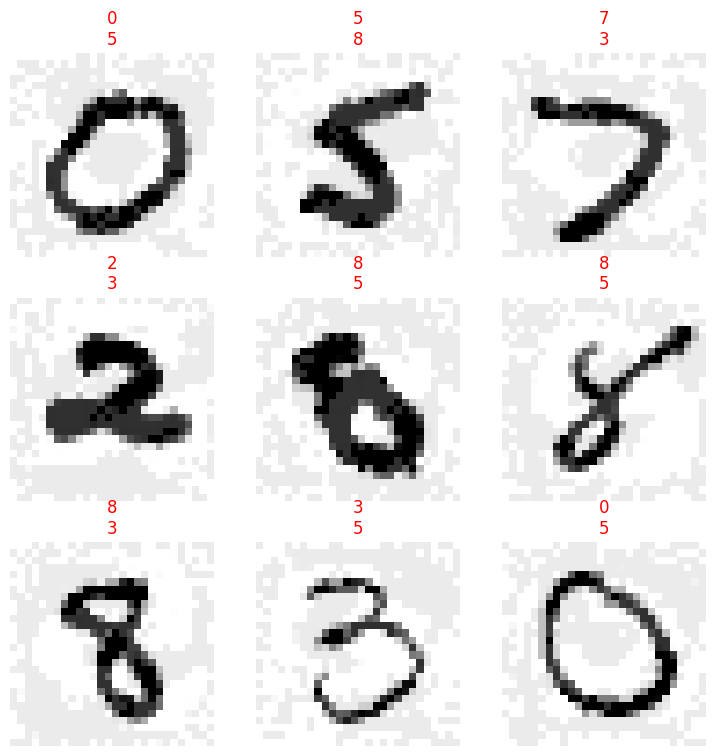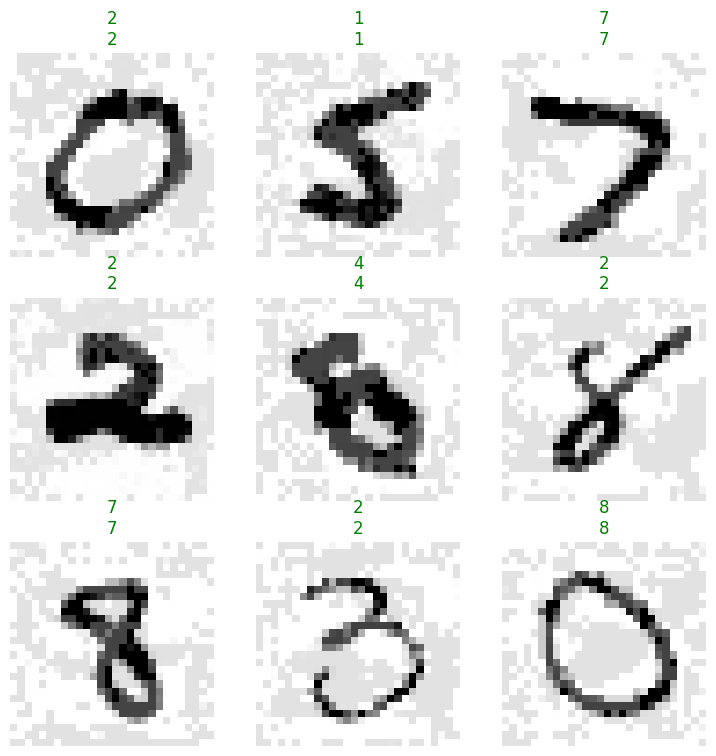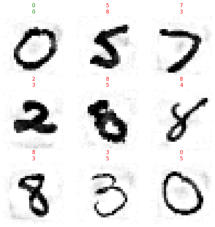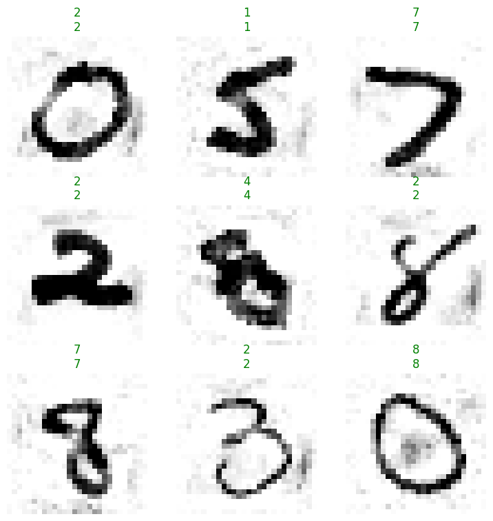 test(acc, .9, ge)learn.show_results(shuffle=False, dl=TfmdDL(perturbed_dsets))